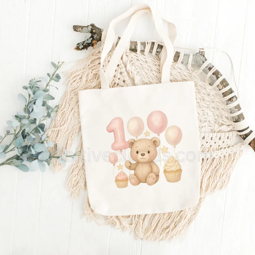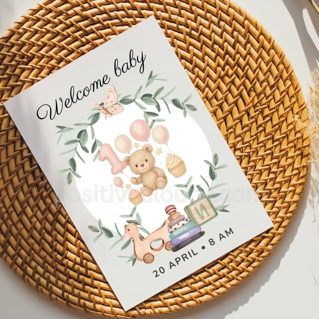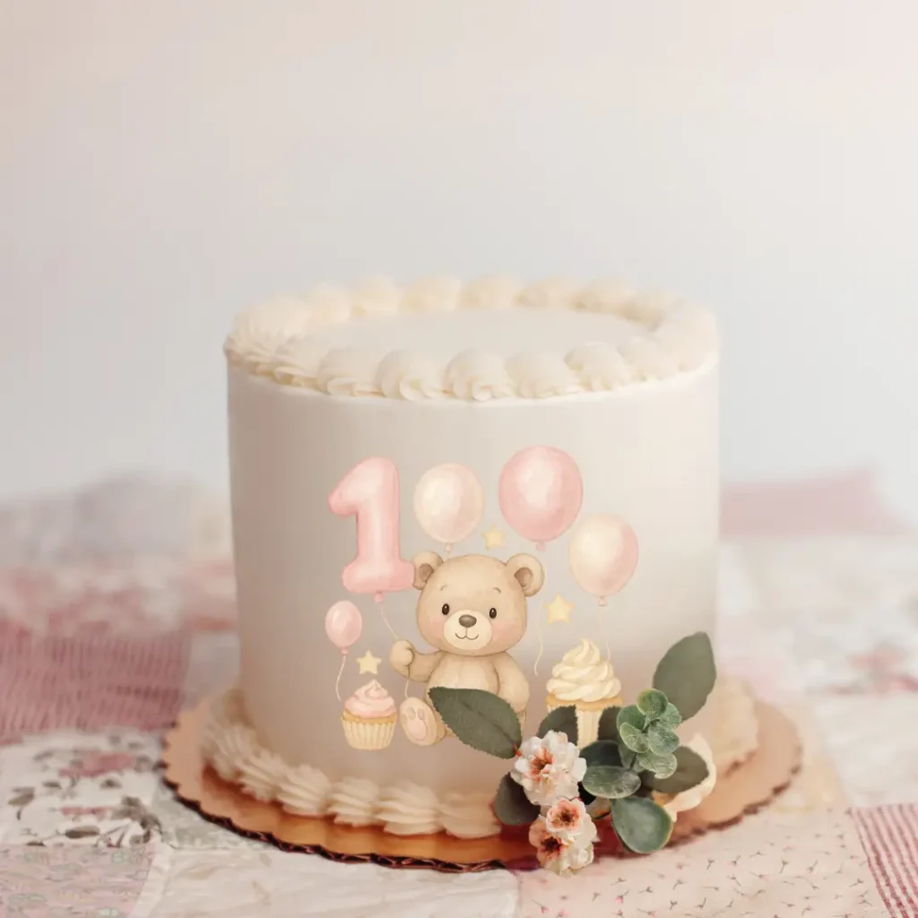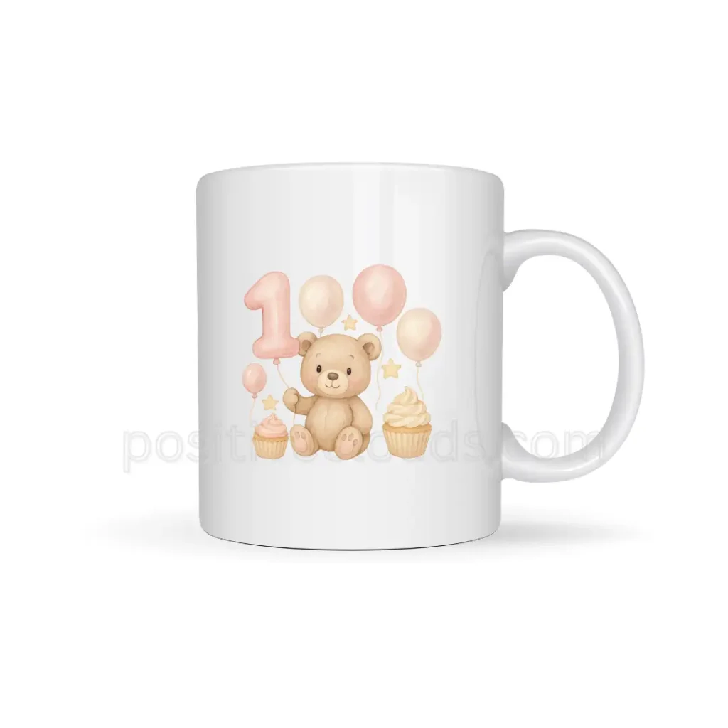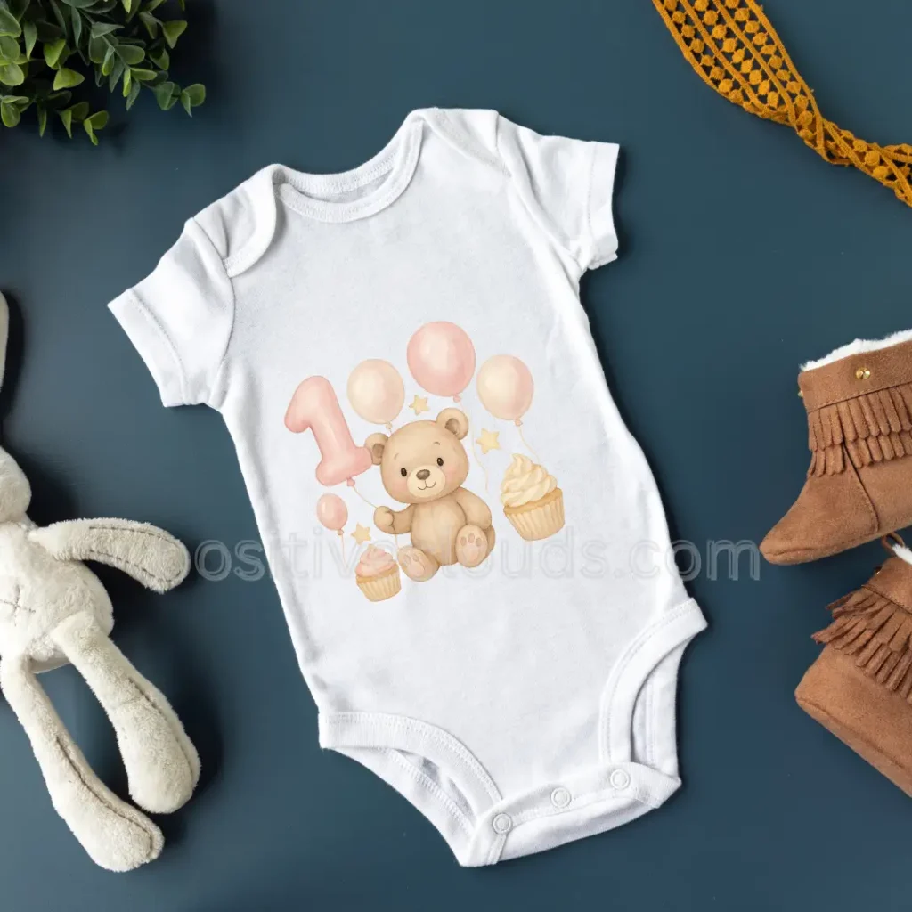 This pastel watercolor design features a smiling teddy bear holding balloons, surrounded by cupcakes, stars, and a big number β1β balloon. Perfect for parents, party planners, and crafters looking to add a touch of cuteness to their creations.